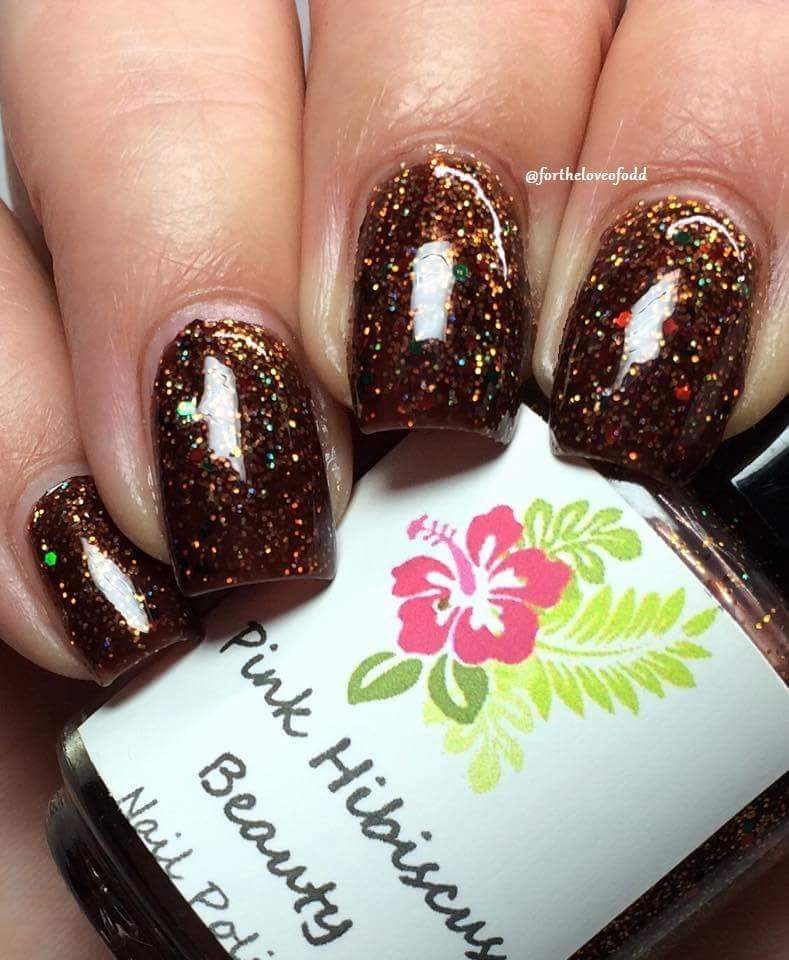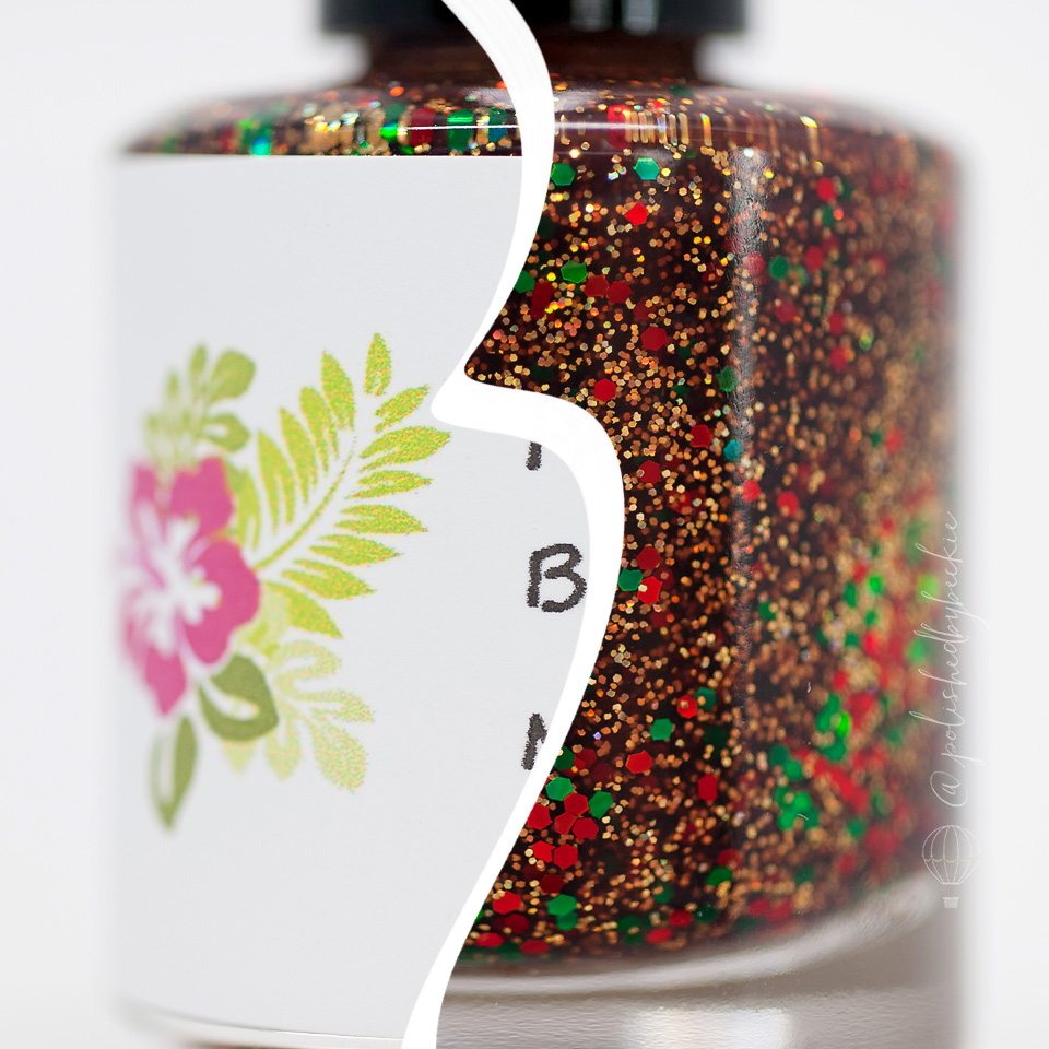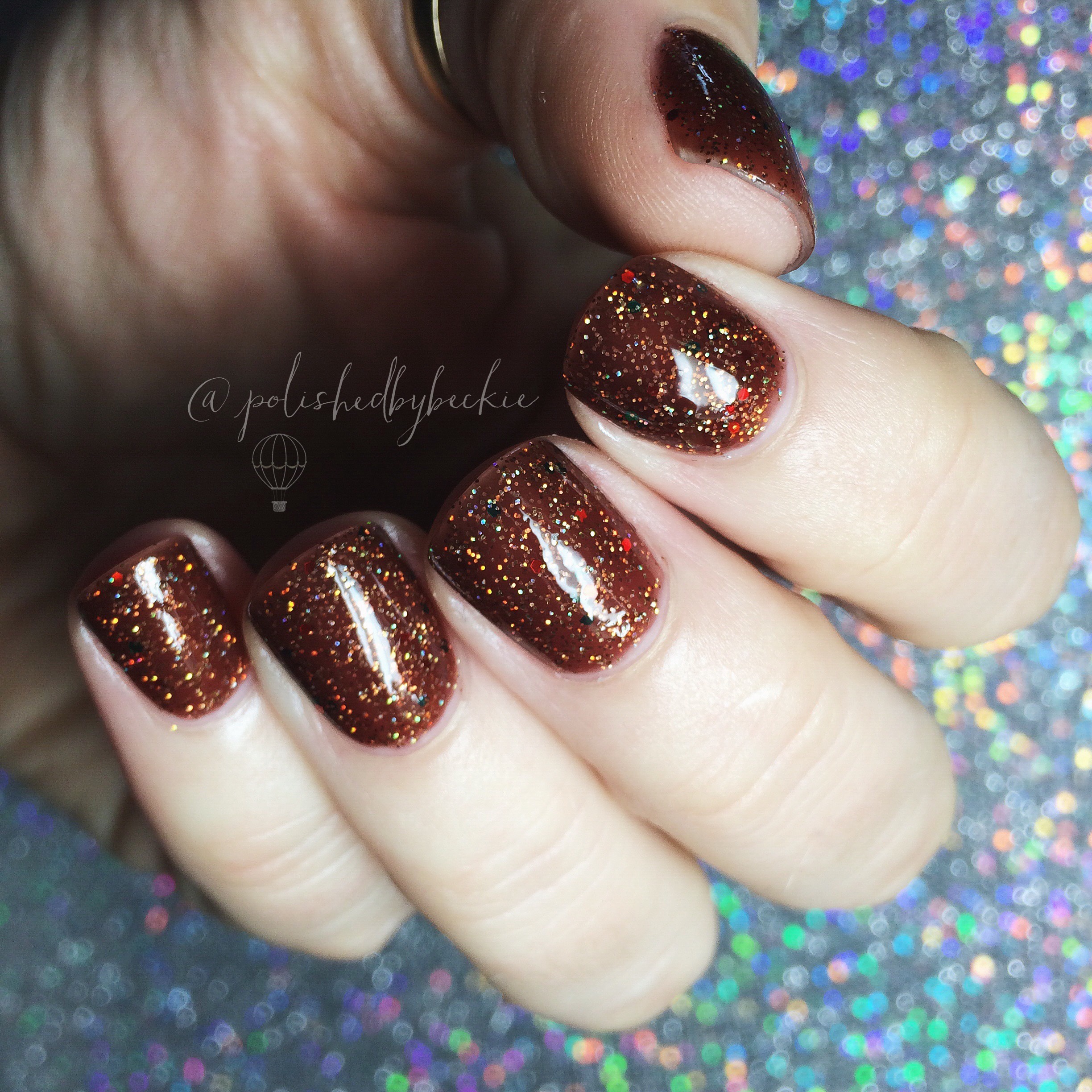 Brown jelly with gold holographic micro glitter, and red and green round glitter.